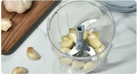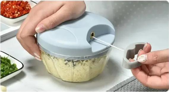 The rotating manual mechanism and sharp blades allow you to chop garlic, onions, vegetables, and meat quickly without electricity.